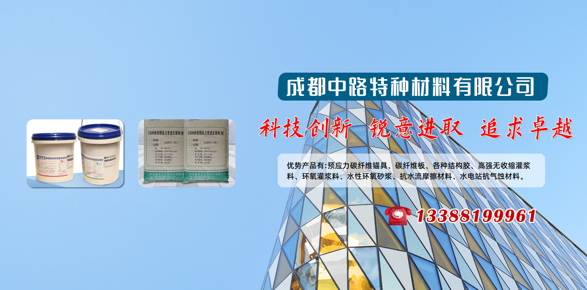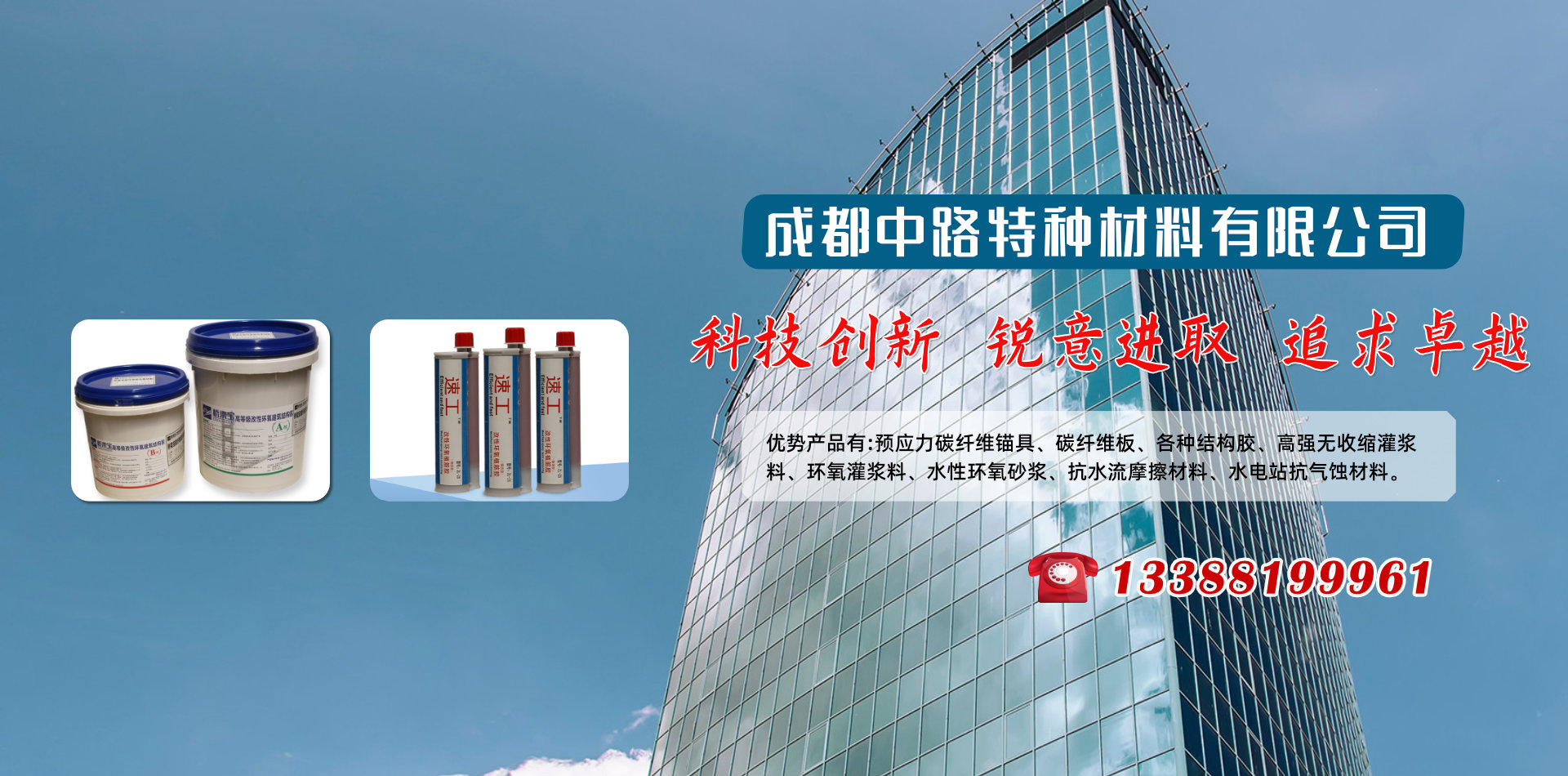 成都中路特種材料有限公司借助清華大學(xué)高分子材料學(xué)科、晨光化工研究院、西南交通大學(xué)、四川交通職業(yè)技術(shù)學(xué)院科研技術(shù)平臺(tái)成為一家集新材料研發(fā)、銷售、技術(shù)服務(wù)和施工于一體的專業(yè)服務(wù)公司,優(yōu)勢(shì)產(chǎn)品有:預(yù)應(yīng)力碳纖維錨具、碳纖維板、各種結(jié)構(gòu)膠、高強(qiáng)無收縮灌漿料、環(huán)氧灌漿料、水性環(huán)氧砂漿、抗水流摩擦材料、水電站抗氣蝕材料和研發(fā)各種特殊用途膠黏劑產(chǎn)品地處西南腹地成都,業(yè)務(wù)覆蓋四川各大中小城市、重慶、云南、昆明、新疆、西藏等區(qū)域。產(chǎn)品涵蓋各種加固施工材料、施工設(shè)備及施工配件,品牌有威士邦等aa進(jìn)口品牌,同時(shí)批發(fā)銷售國(guó)產(chǎn)高、中、低端品牌,為客戶提供全面參考。